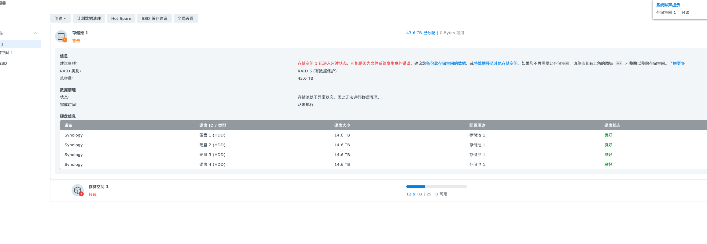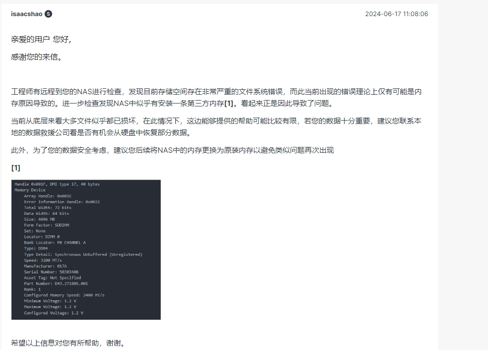 然后请求了群辉官方支持,官方给出的解决是因为内存错误导致存储空间损坏,虽然我不认可,但是存储空间损坏优先转移数据为主,所以如果打算存储重要数据尽量别考虑黑群辉,不然的话出了问题非常难解决。